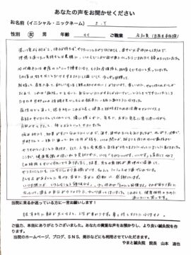 耳鳴り、音が聞こえにくい、と思えば音が大きく聞こえたり、違和感を感じ、耳鼻科に受診した所『突発性難聴』と診断され、ステロイドの飲み薬を服用し通院しましたがさらに悪化し、薬の量を増やすか、ストロイドの点滴を勧められたのですが、副作用が酷く辛かったので以前からやまと鍼灸院さんの評判を聞いていたので見て頂く事に決心しました。